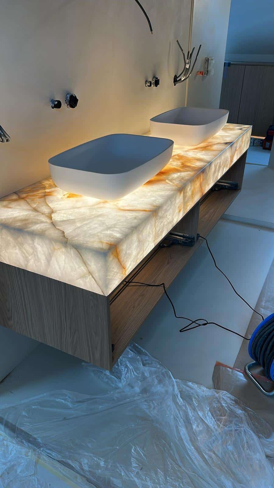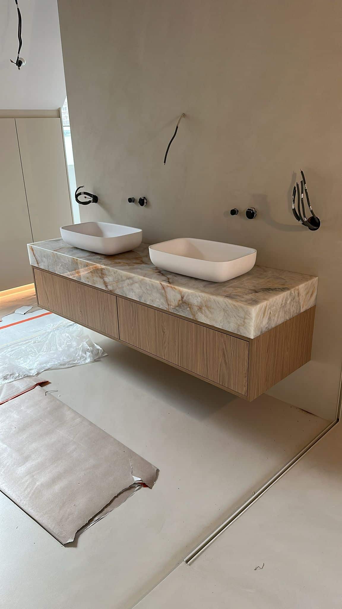 Een interieur groeit stap voor stap. Wat begint als een idee op papier of een 3D-tekening, krijgt langzaam vorm dankzij de samenwerking van verschillende experts en de keuzes van de klant. Dit project toont hoe passie, vakmanschap en oog voor detail samenkomen in een uniek resultaat: een zwevende kast met lichtdoorlatende natuursteen.